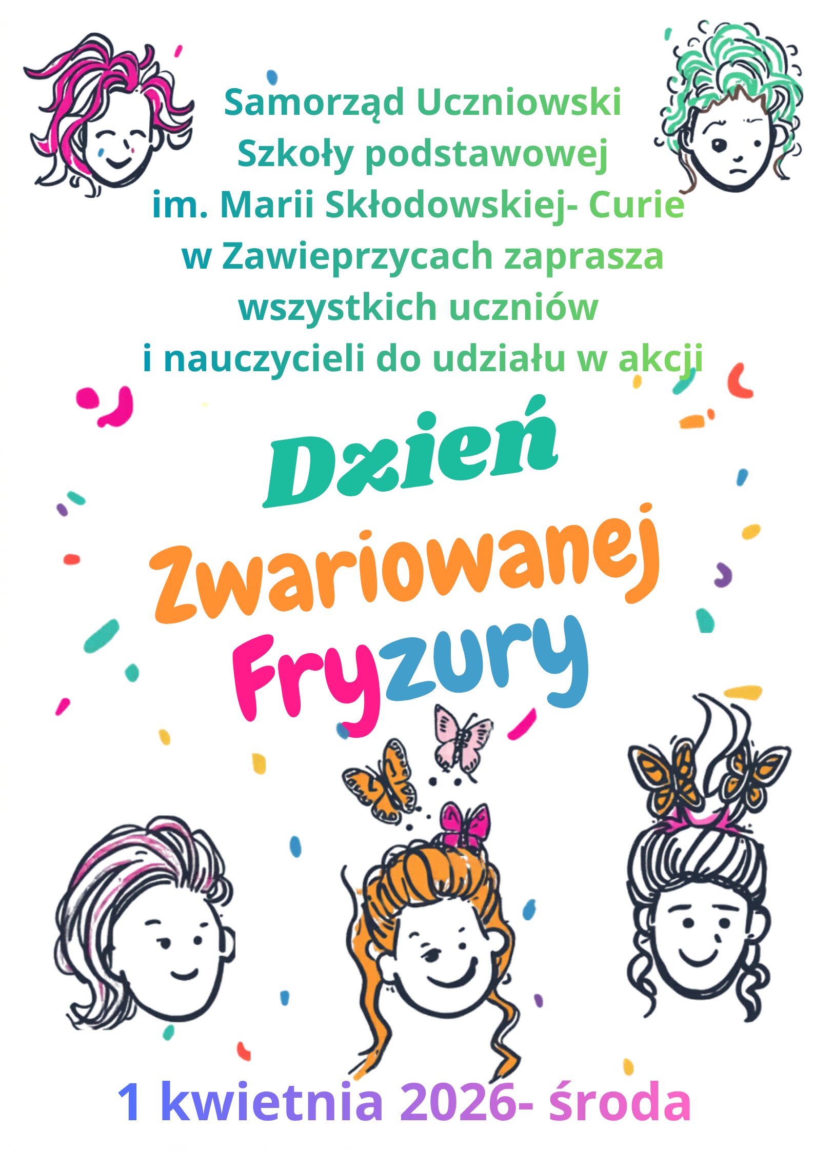 Samorząd Uczniowski zachęca wszystkich uczniów i nauczycieli do udziału w akcji „Dzień Szalonej Fryzury”. W środę 1 kwietnia z okazji prima aprillis przyjdź do szkoły w niecodziennej, zabawnej fryzurze!