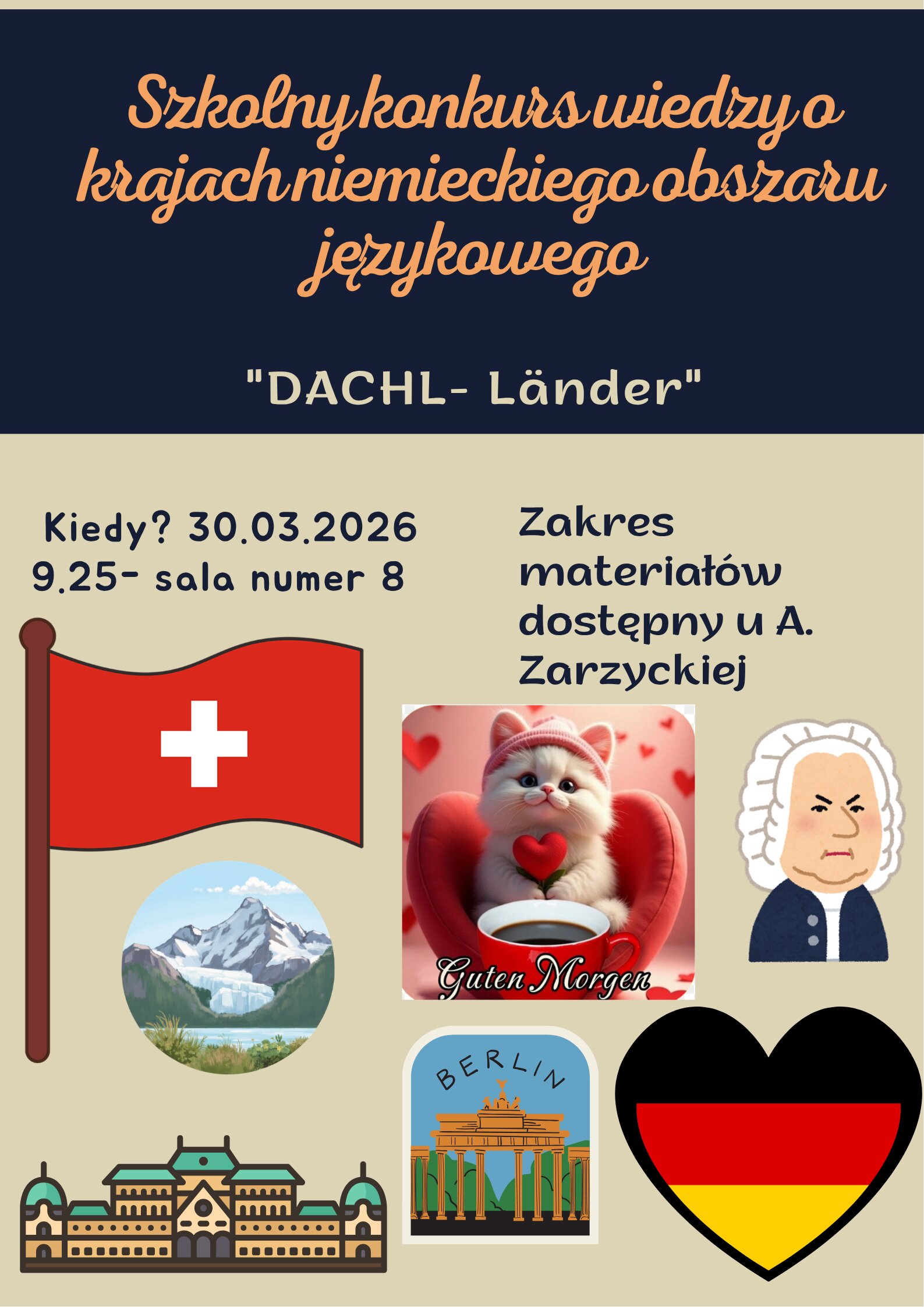 Masz w małym palcu geografię Niemiec? A może fascynuje Cię kultura Austrii i Szwajcarii? Pokaż, co potrafisz i weź udział w naszym szkolnym konkursie wiedzy o krajach niemieckojęzycznych!