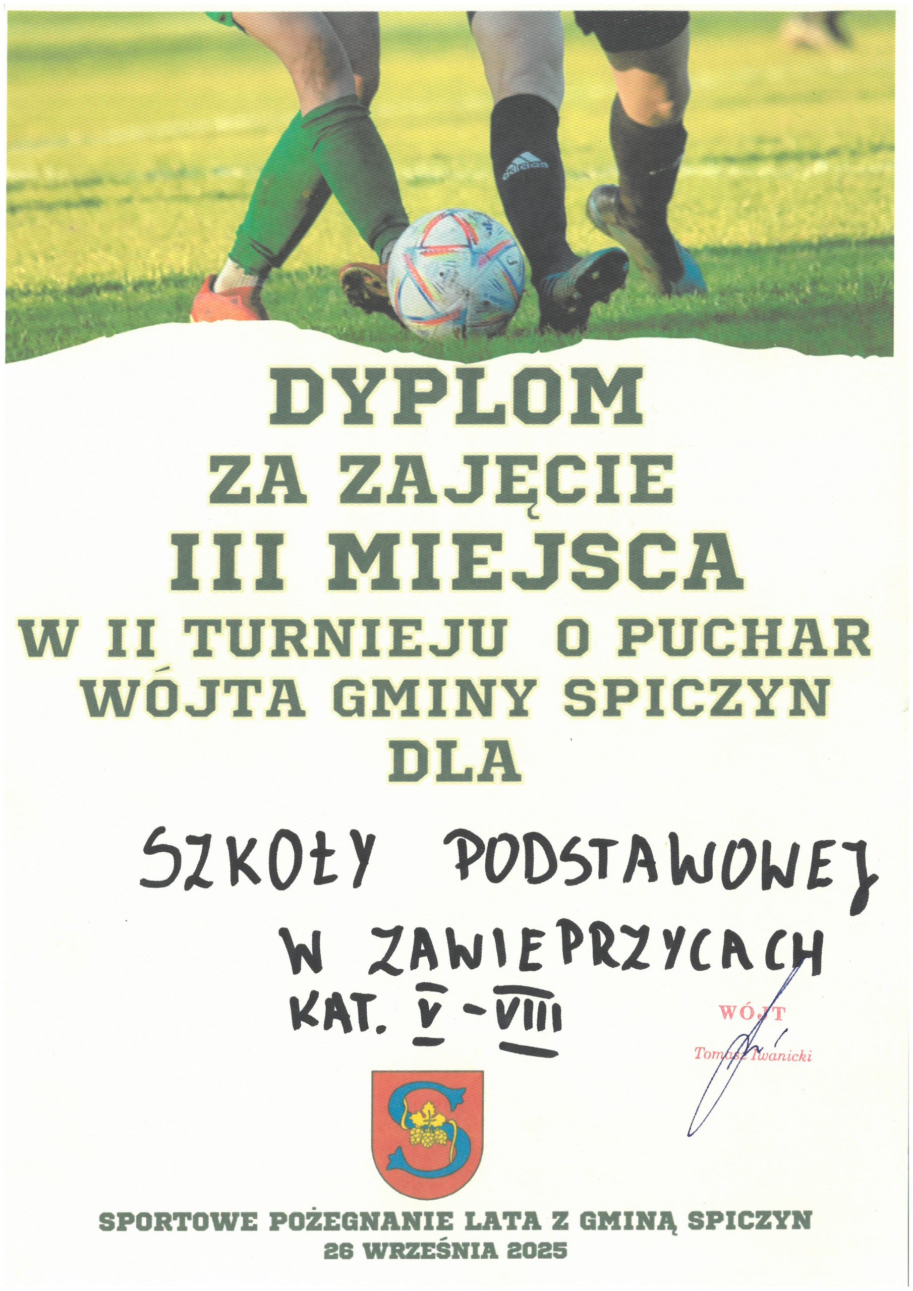 26 września 2025 reprezentacja naszej szkoły w  piłce nożnej pod okiem trenera Pana Rafała Zarańskiego wzięła udział w Sportowym Pożegnaniu Lata – zawodach w piłce nożnej o puchar Wójta Gminy Spiczyn. Nasi uczniowie dumnie reprezentowali szkołę, a w rozgrywkach wywalczyli puchar i III miejsce. Gratulujemy!