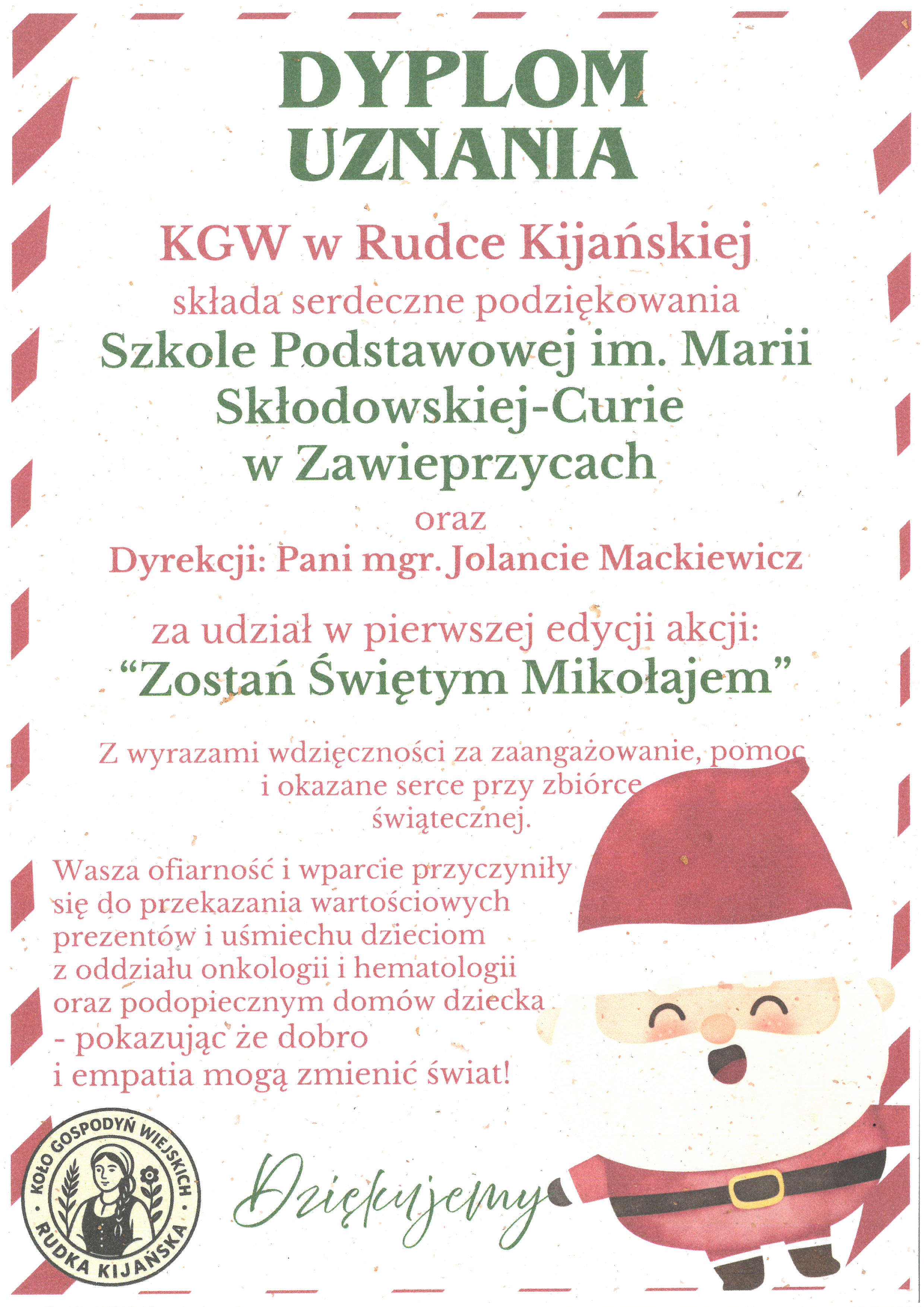 W dniach 24-28.11.2025 w naszej szkole odbyła się zbiórka rzeczy na paczki dla dzieci z Oddziału Hematologii i Onkologii oraz dzieci z domów dziecka w Kijanach i Witaniowie. Organizatorami akcji „Zostań Świętym Mikołajem” było Koło Gospodyń Wiejskich w Rudce Kijańskiej.