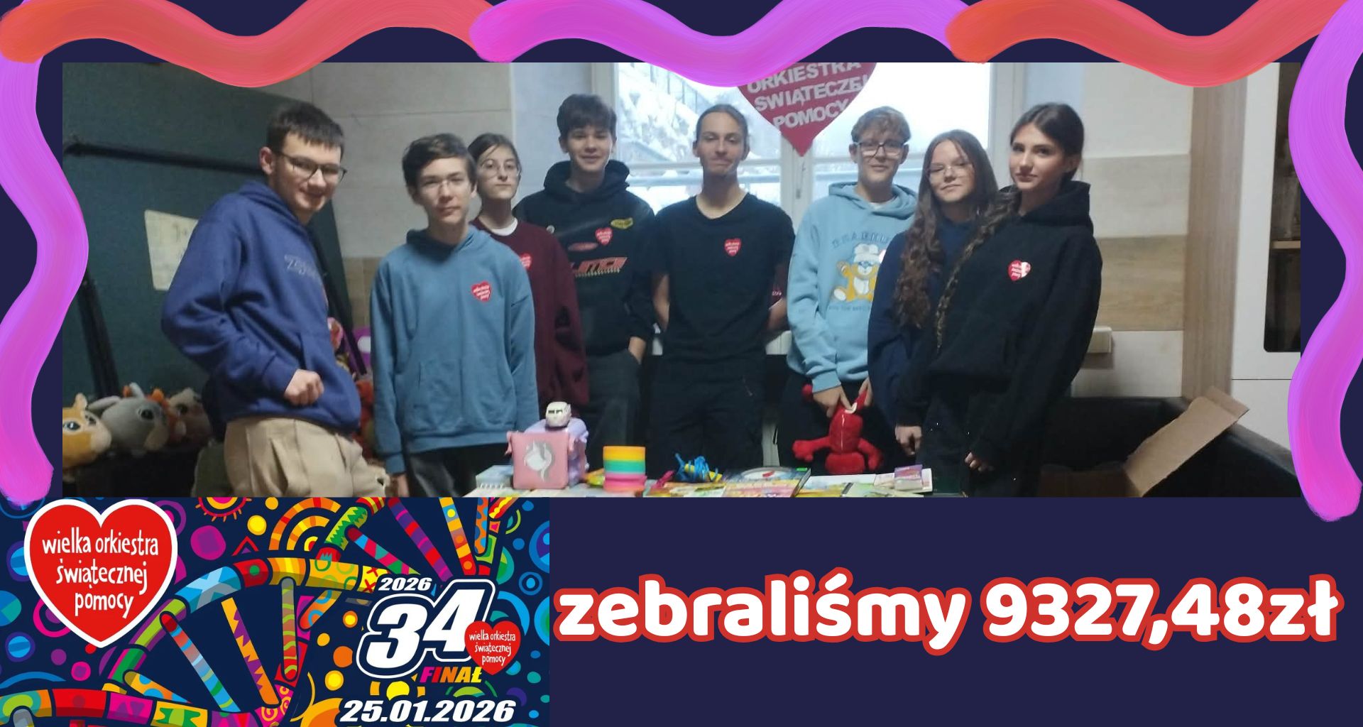 Z radością dzielimy się podsumowaniem szkolnych działań na rzecz Wielkiej Orkiestry Świątecznej Pomocy 2026. W tym roku naszą szkołę reprezentowało czworo wolontariuszy: Zuzia, Klara, Gucio i Szymon, jednak ogromny wysiłek organizacyjny wzięła na siebie cała klasa ósma.
