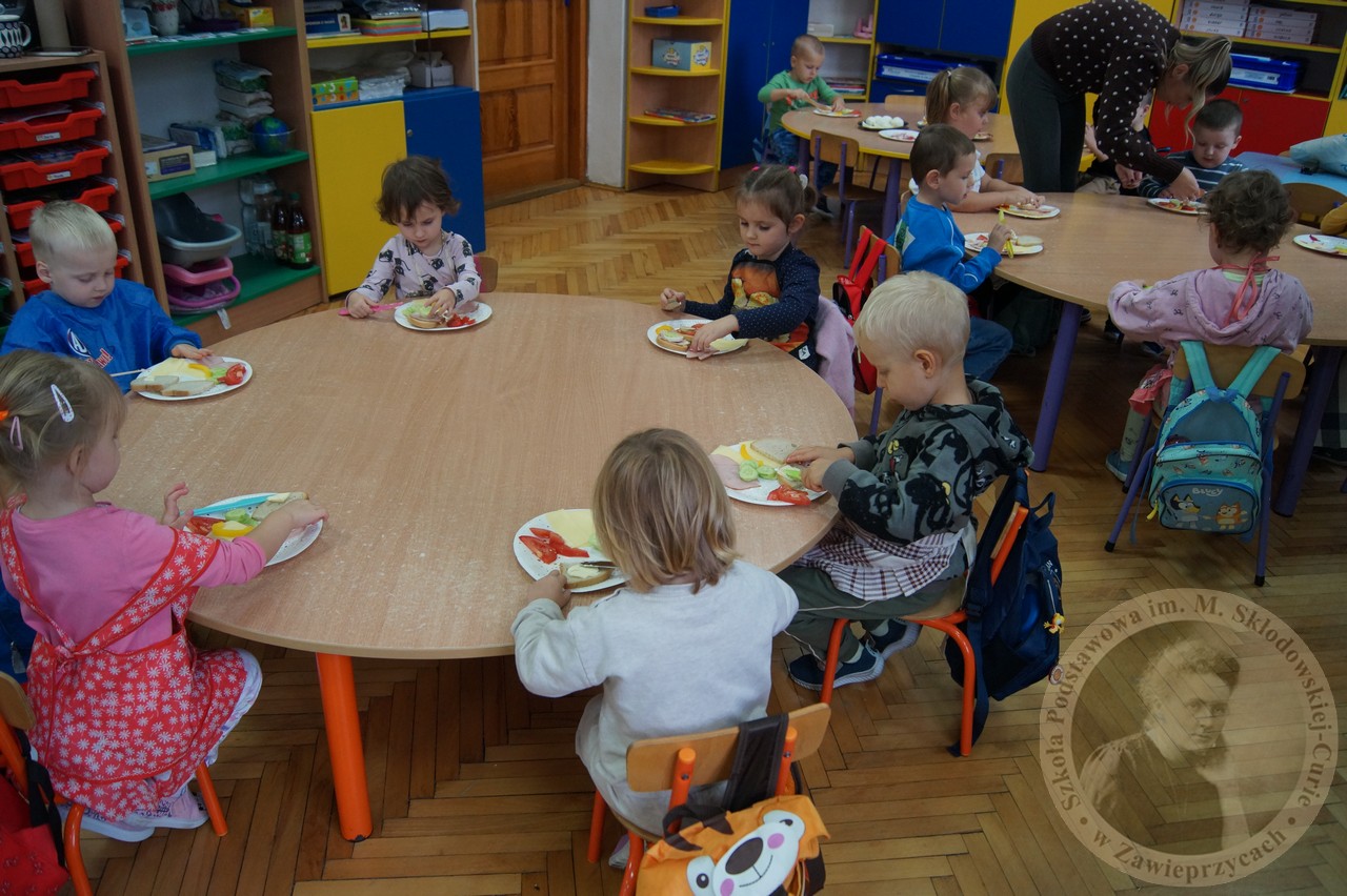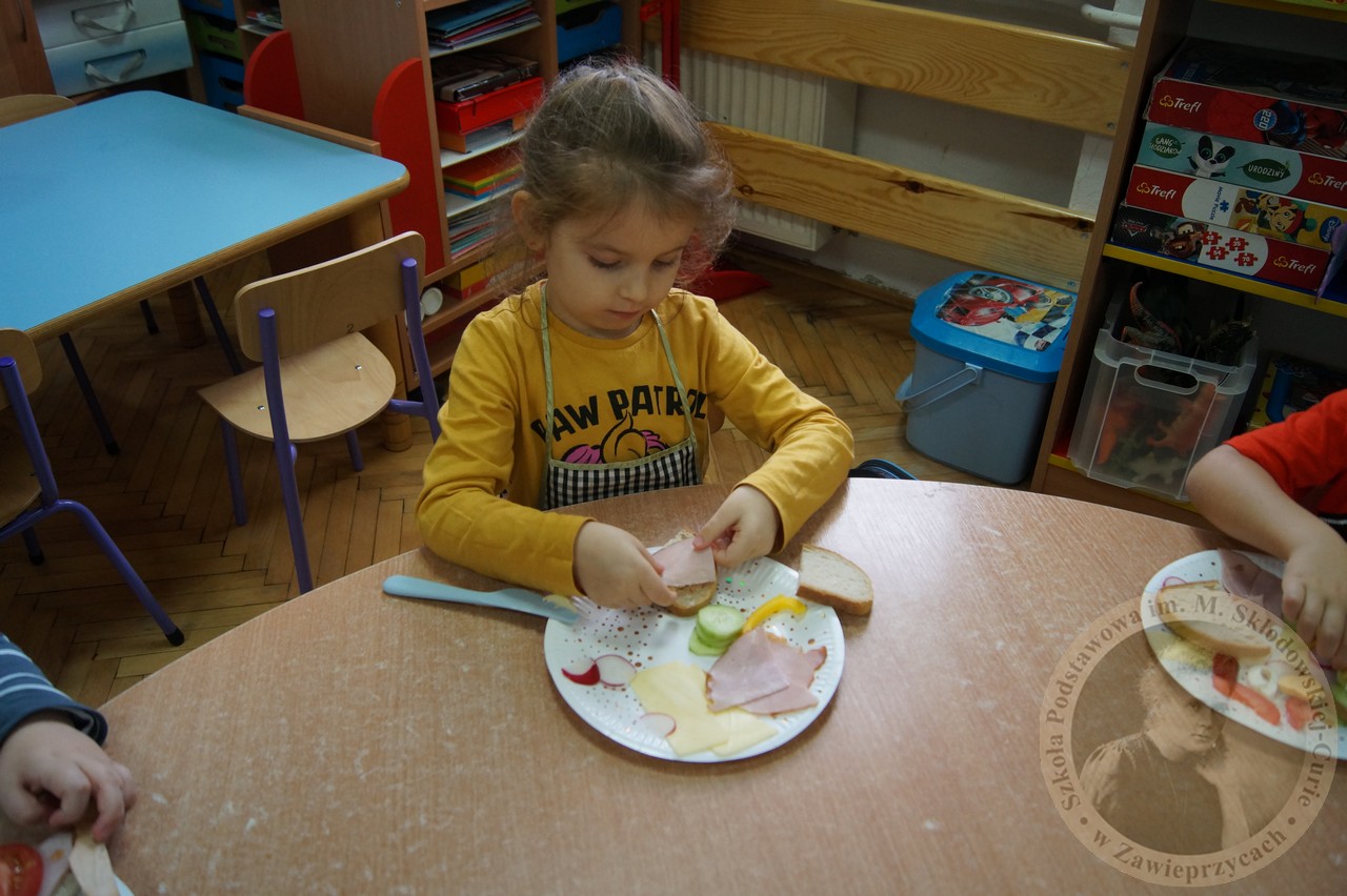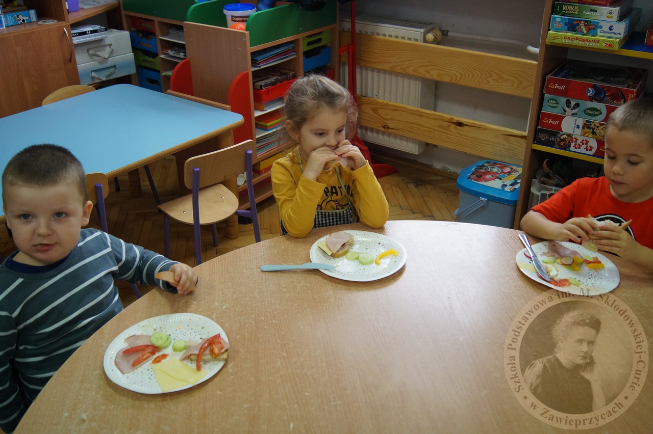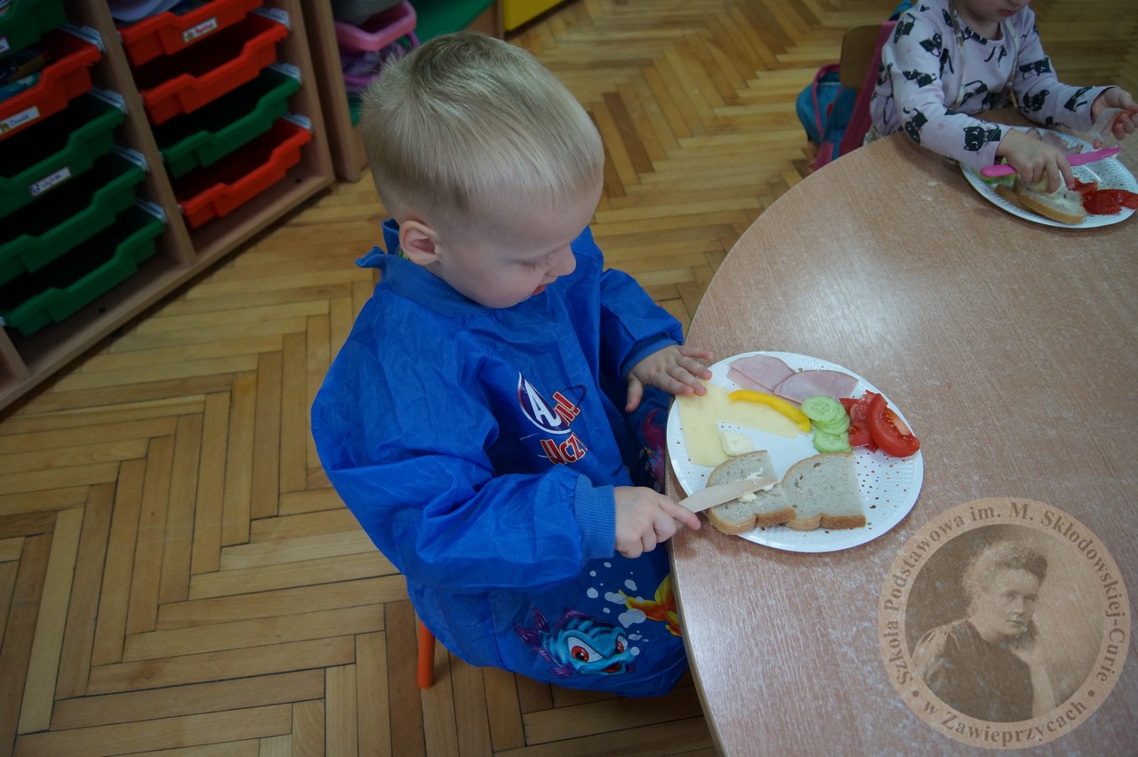 Już od najmłodszych lat uczymy się, co oznacza dla nas zdrowy posiłek, pełen witamin, dający nam energię i moc . W grupie Smerfy zapoznaliśmy się z pojęciem piramidy zdrowia, rozmawialiśmy o tym co jest dla naszego organizmy potrzebne a co nam szkodzi. Na koniec każde z dzieci przygotowało swoją pyszną kanapkę. Było zdrowo i kolorowo.