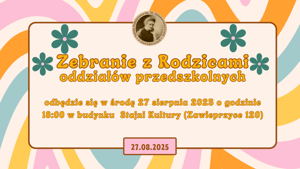 Zebranie z Rodzicami – Oddziały Przedszkolne Zebranie dla wszystkich Rodziców dzieci przedszkolnych (tj. grupa smerfy i grupa skrzaty) odbędzie się 27 sierpnia godz. 18:00 w budynku Stajni Kultury (Zawieprzyce 120). SERDECZNIE ZAPRASZAMY
